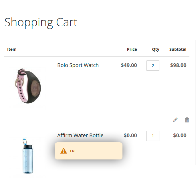 Message For The Free Item In The Cart - Specify the default message to display it next to free or discounted items in the shopping cart.