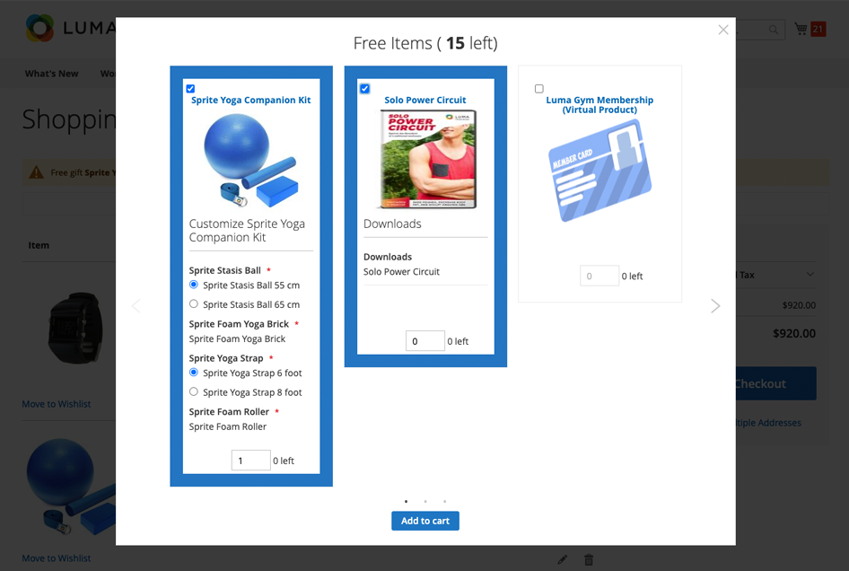 Get four additional promo actions to automatically add free items to cart. Display custom banners to inform visitors about special offers and let them select a gift among available promo products.
