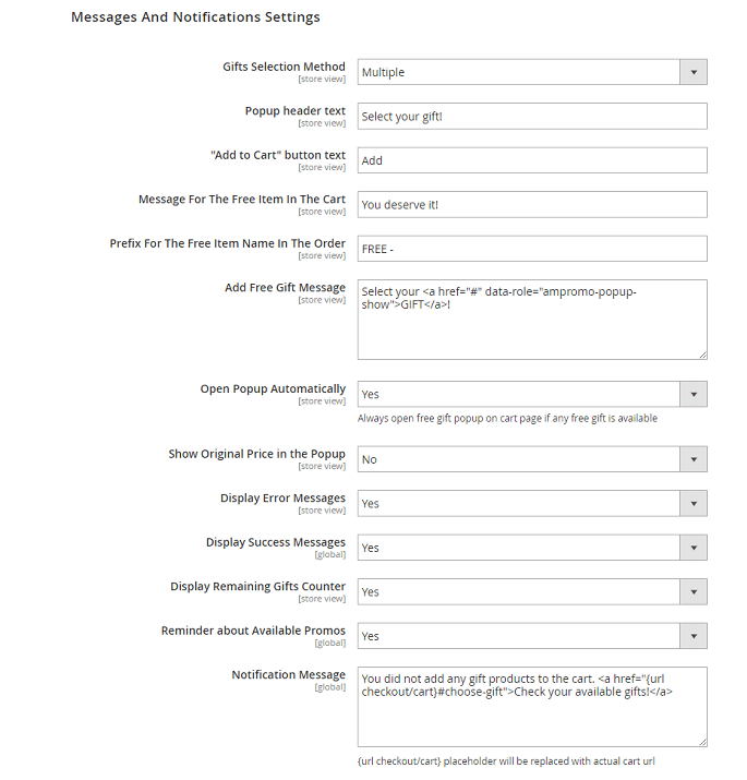 Reminder about Available Promos - Use this option to show a special reminder message on the frontend catalog pages to inform customers about available gifts. Set the option to 'Yes' to specify a custom message.