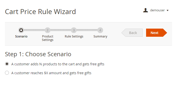 Free Gift Rules Wizard allows to create all basic rules simply in 4 steps. It will help you to avoid complicated settings and configure a rule quickly.
