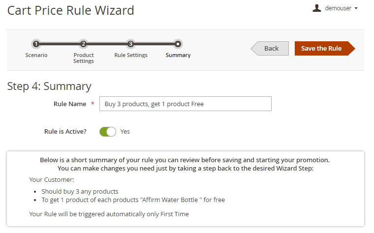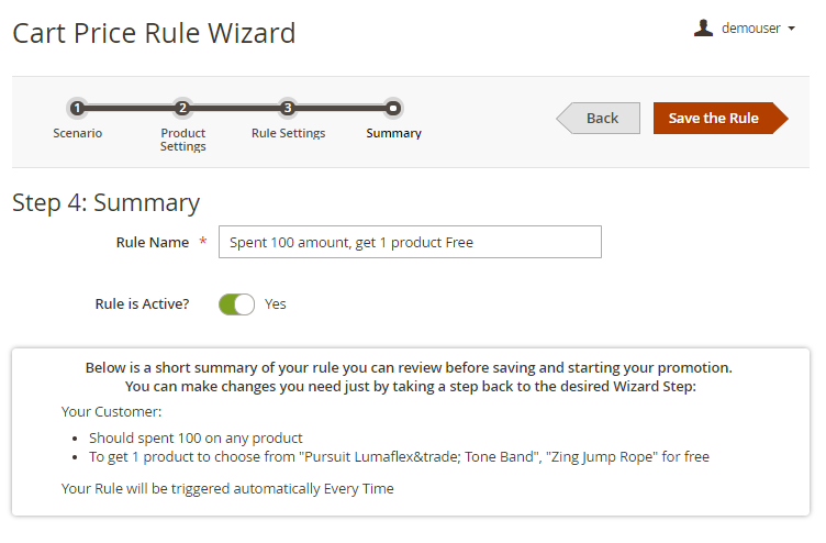 In this block you will see an auto generated preview of the rule: it helps to check without leaving the page how the rule will work. If the summary does not match your requirements, you can easily go to the necessary step and change the settings.