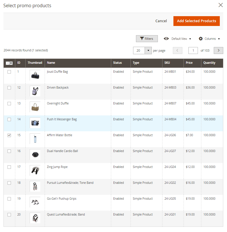 Click Add products button to choose the needed ones from your list. Tick them and hit the Add selected products button.