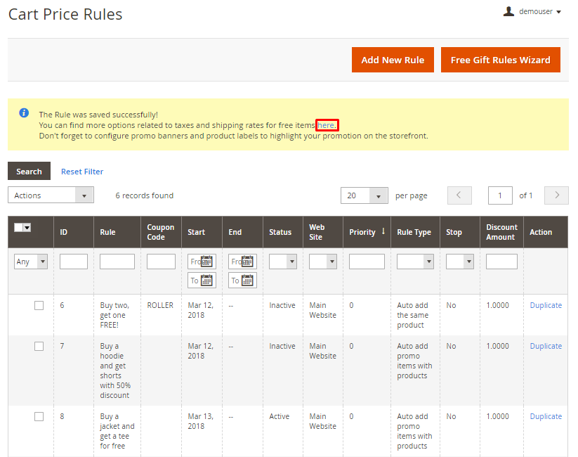 You will be redirected to the Cart Price Rules grid. In the convenient pop-up you can use a link to set more advanced configuration such as promo banners, product labels, etc.