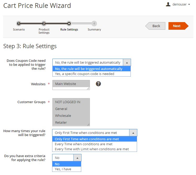 The extension allows to apply the rules only after a particular coupon is used. Specify if the rule will be triggered automatically or a specific coupon code is needed.