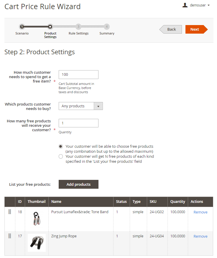 Here specify Cart Subtotal amount in Base Currency, before taxes and discounts that a customer should spend. Then, similar to N products rule, select products that a customer need to buy, how many free products your customer will receive and choose promo products.