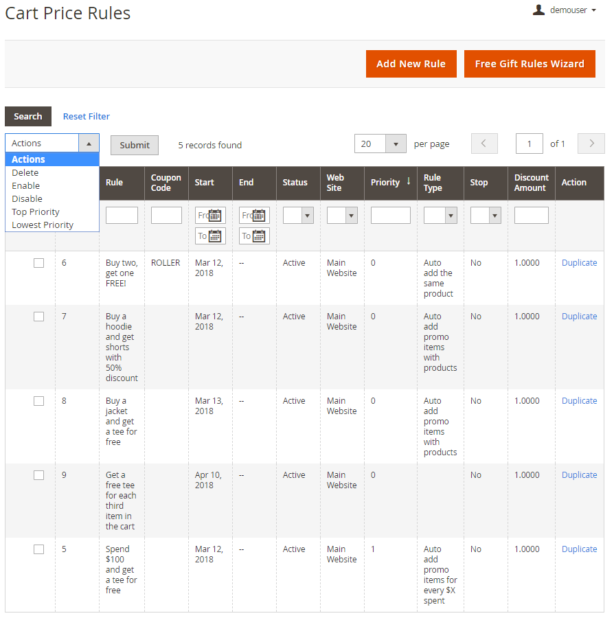 To perform mass action, tick them and expand Actions dropdown menu. It is possible to Delete, Enable/Disable rules, set Top Priority or Lowest priority right on the grid. Click Submit to apply an action.