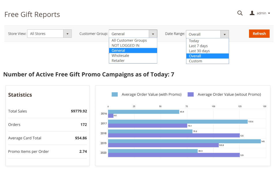 To update the statistics, please go to Reports → Statistics → Refresh Statistics. Then, on a grid, select the Amasty Free Gift report and press the Submit button.
