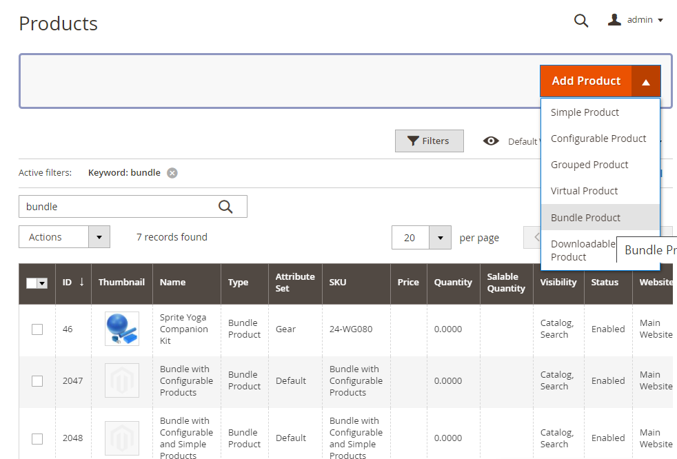 To create a new Bundle product please go to Catalog > Products > Add Bundle Product page: