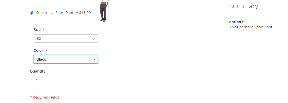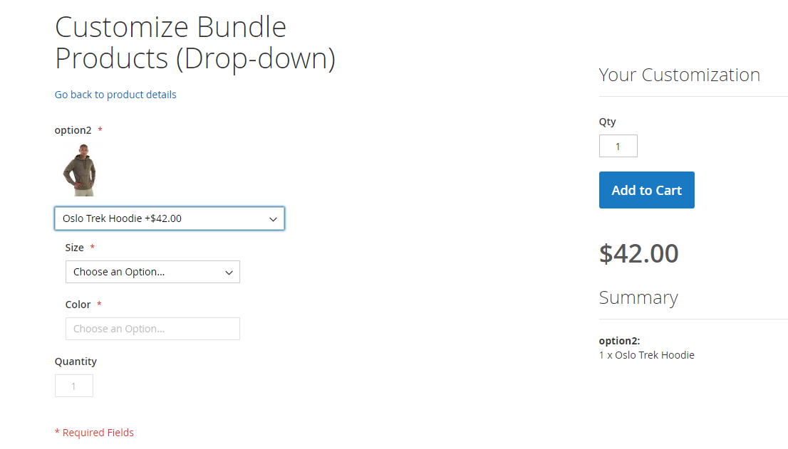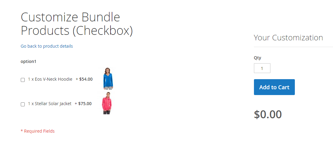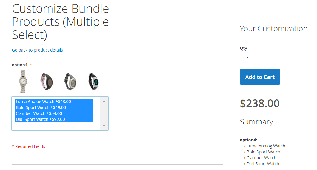 Here is an example how Bundle product will be shown on storefront. We’ve created a Bundle with the following options: