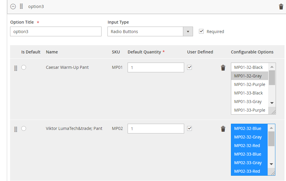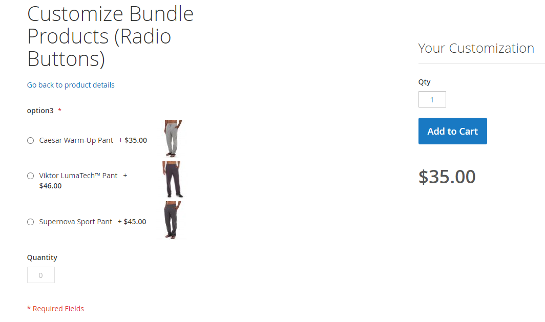 Here you can see Bundle’s option with two radio buttons, each contains configurable product with inputs to define its options. Quantity could be defined by customer manually.