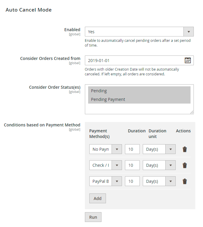 Cron is running each hour by default. If you need to apply Auto Cancel immediately, click the ‘Run’ button (before performing the action, please make sure that conditions are saved).