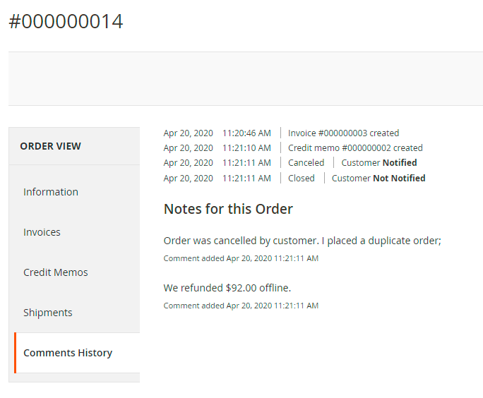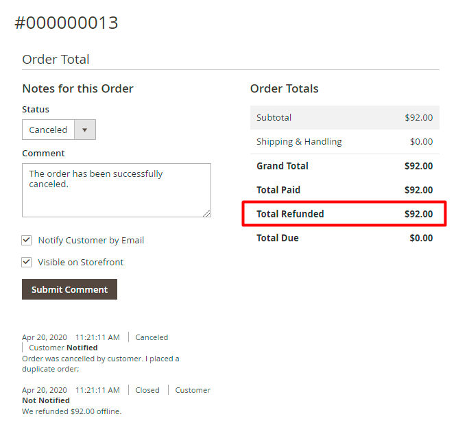 In the Infromation tab and Order Total section you can view cancellation and refund details. Leave comments and set notifications when the status is updated if needed.