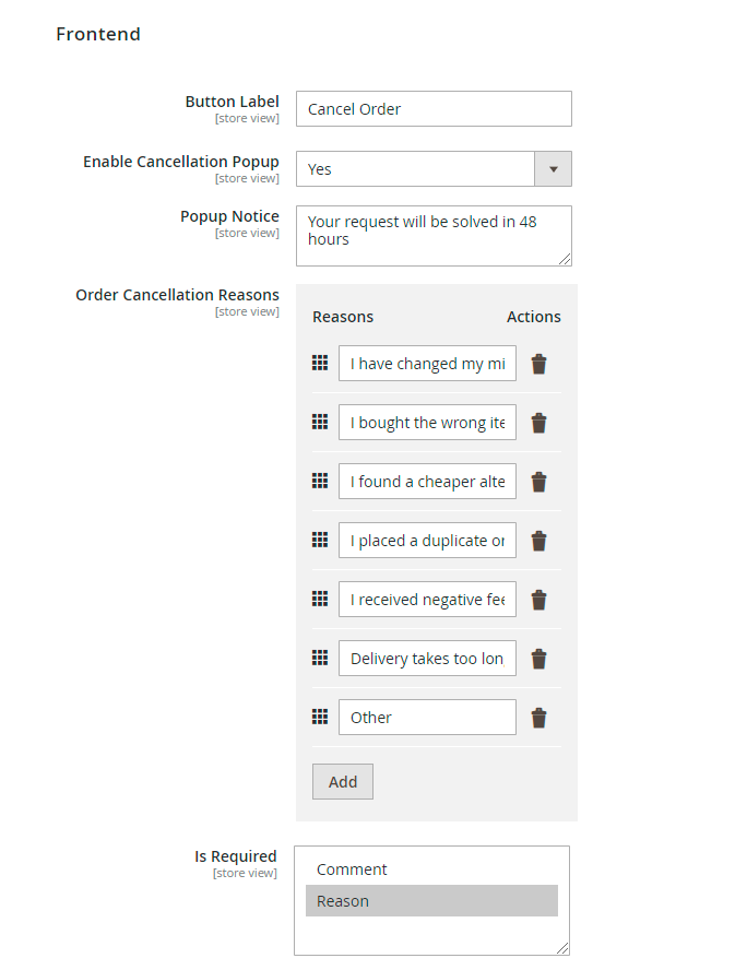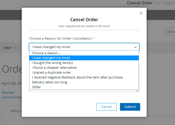 Order Cancellation Reasons - add the reasons for Cancel Order and set the sequence for frontend display using drag-and-drop. Customers will be able to choose the necessary reason in a dropdown.