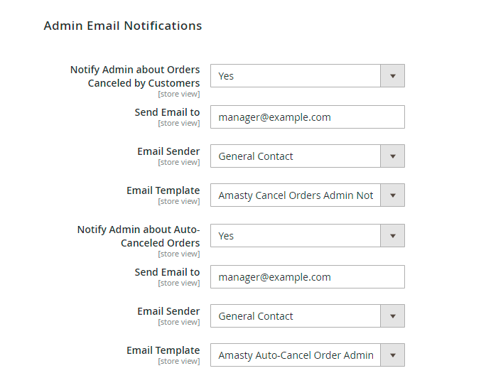 Enable the feature and specify to whom emails should be sent. Also, select email sender and choose the template for notifications about orders canceled by customers.