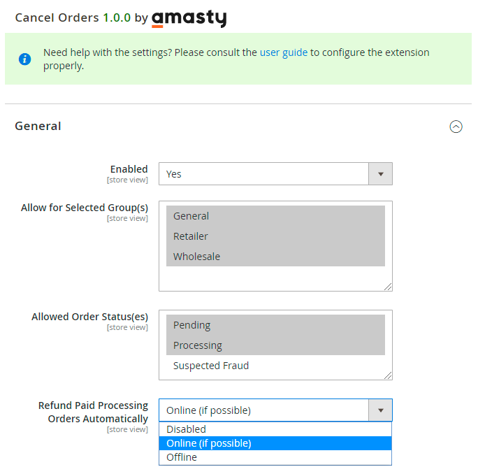 To adjust the basic extension setting, navigate to Stores → Configuration → Amasty Extensions → Cancel Orders tab.
