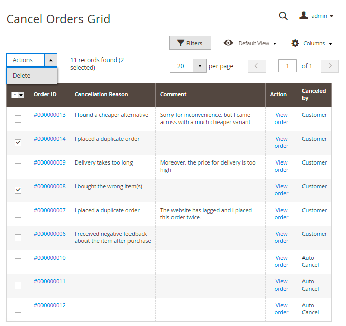 For admin's convenience, the extension places all canceled orders in a separate grid. To track and manage them, navigate to Sales → Amasty Cancel Orders → Cancel Orders Grid.