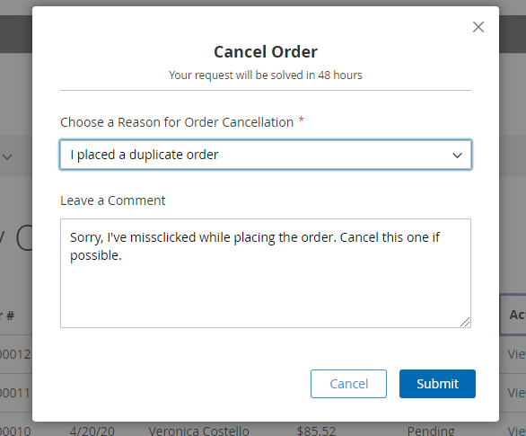 After clicking the button, a popup with the reasons in a dropdown is displayed. Users can select one of the existing cancellation reasons and add their own ones to a Comment field.