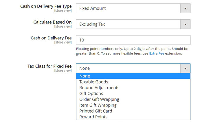 Tax Class for Fixed Fee - this setting is only displayed when the Cash on Delivery Fee Type is set to Fixed Amount. Choose the appropriate class for the COD tax. If set to None, the tax won't be calculated.