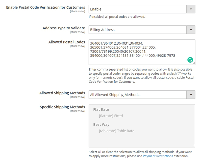 Allowed Postal Codes - specify postcodes eligible for Cash on Delivery. Enter a comma-separated list of individual codes you want to allow. Write down codes separated with a slash “/” symbol to allow the range of codes to save time and authorize the entire state or country. For example, the entry '73001/73199' means that all codes from 73001 to 73199 including, are allowed for Cash On Delivery. If you want to allow all postal codes, disable Postal Code Verification for Customers.