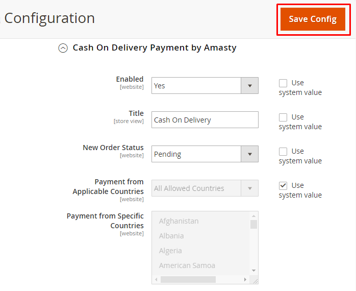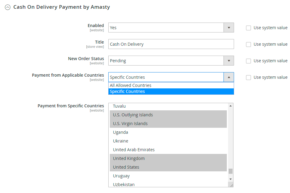 Payment from Applicable Countries - set to All Allowed Countries if you want to offer ‘Cash on Delivery’ payment method for customers from all countries. If not, choose the Specific Countries option in this tab.