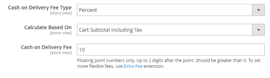 If you've configured fees as Percent, set Cash on Delivery fee as a percentage of cart subtotal. Use floating-point numbers only, up to 2 digits after the point. The numbers should be greater than 0.