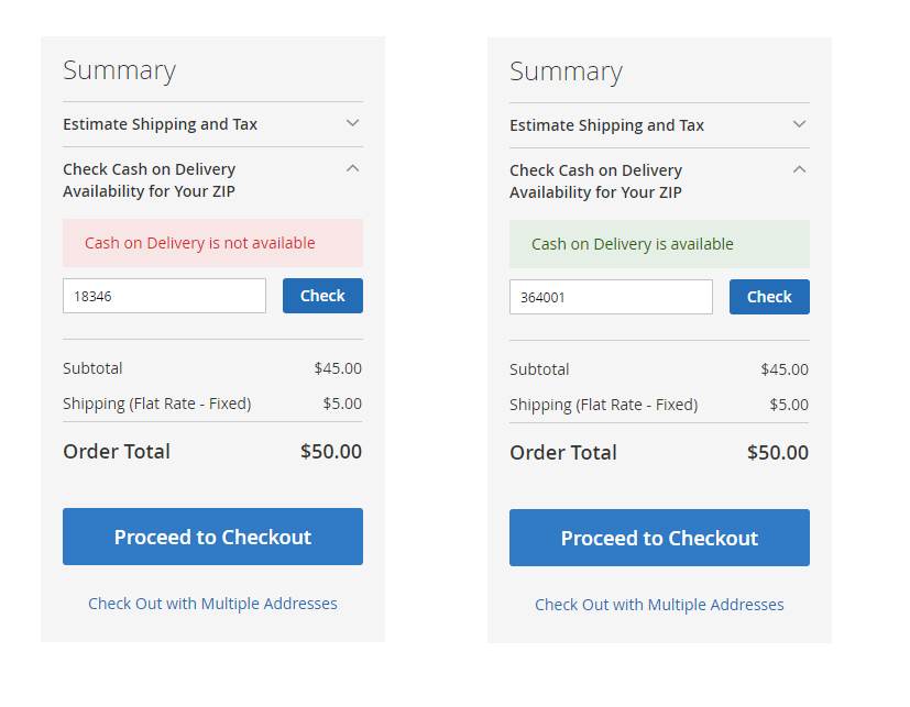 Customers can check the Cash on Delivery payment availability in their region by entering a ‘ZIP code’ in a summary block on a shopping cart page.