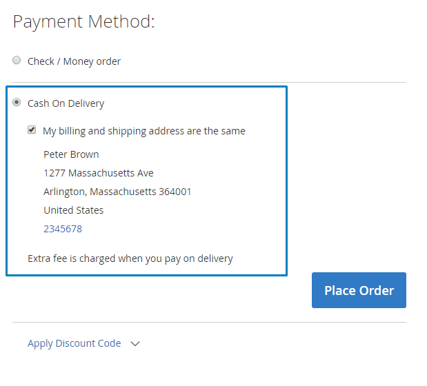 On the checkout page customers can choose Cash on Delivery payment method and see the instructions with additional information regarding COD (e.g. Extra fee is charged when you pay on delivery).