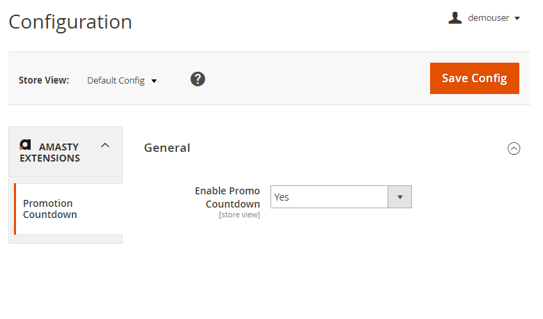 To enable the extension, go to Stores → Configuration → Amasty Extensions → Promotion Countdown.