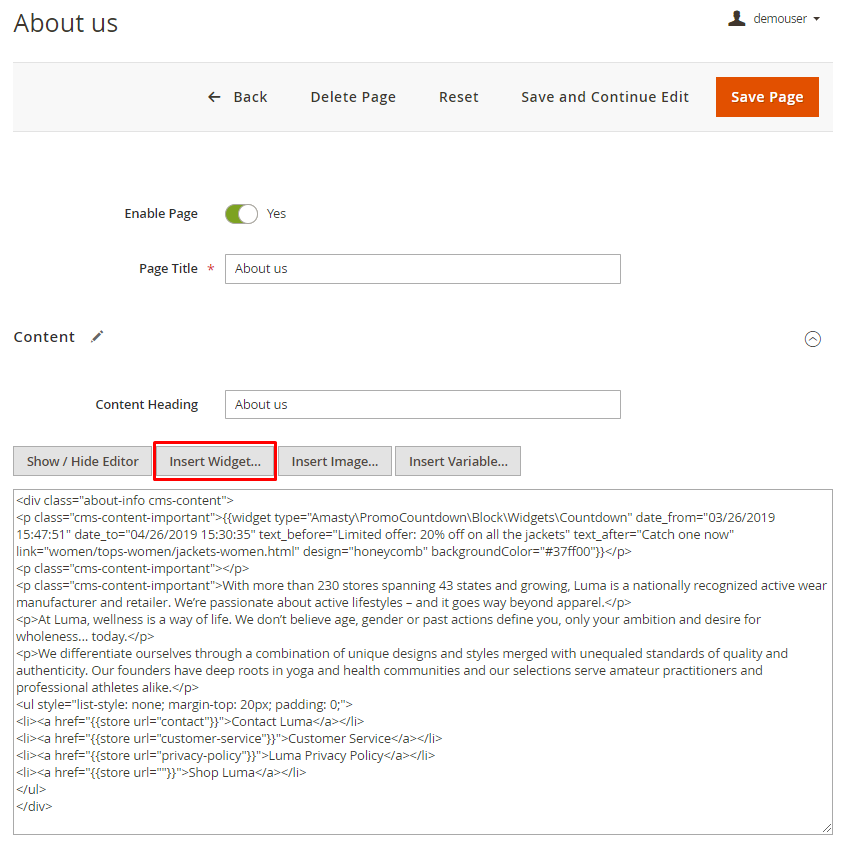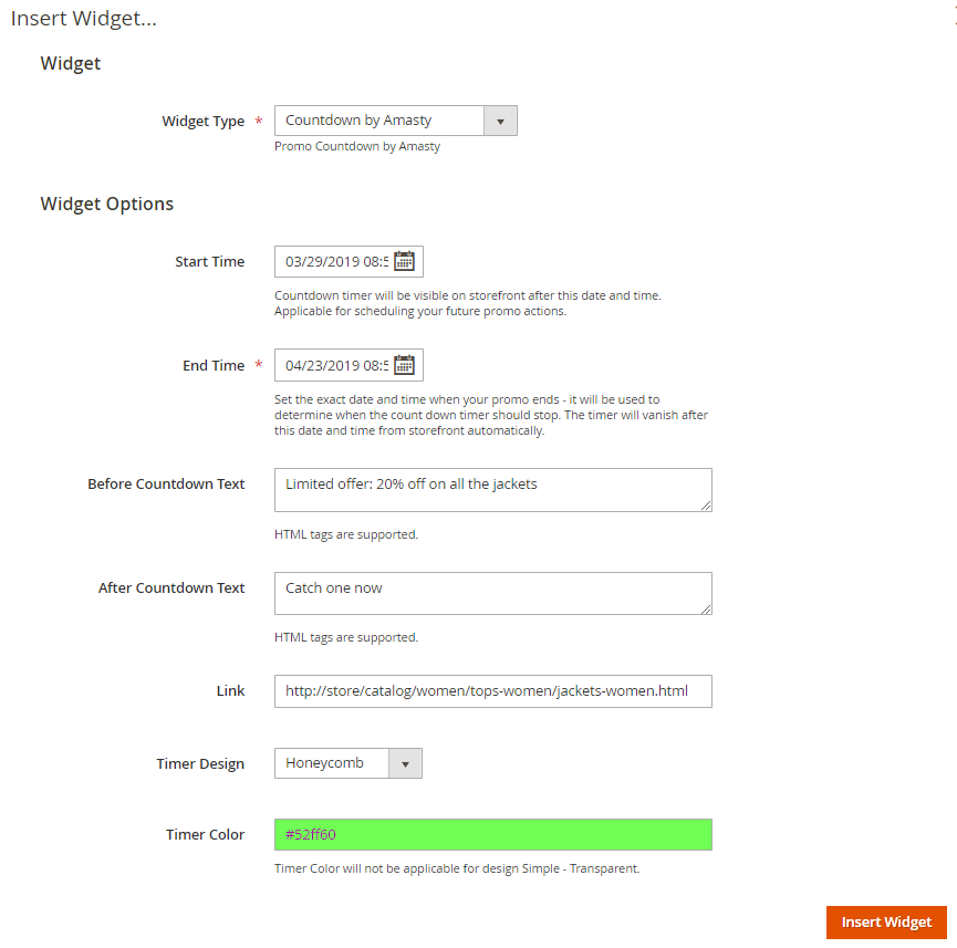 Choose Countdown by Amasty as a widget type, configure the timer and hit the Insert Widget button one more time.