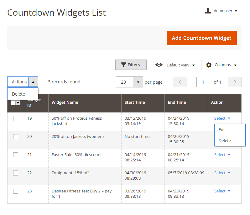 To see and manage all the timers in one grid, go to Amasty → Promotion Countdown → Countdown Widgets List.