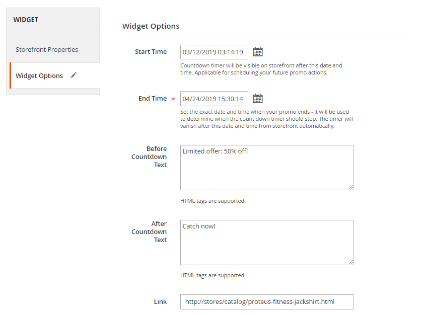 End Time - set the exact date and time when your promo ends: it will be used to determine when the count down timer should stop. The timer will vanish after this date and time from the storefront automatically.