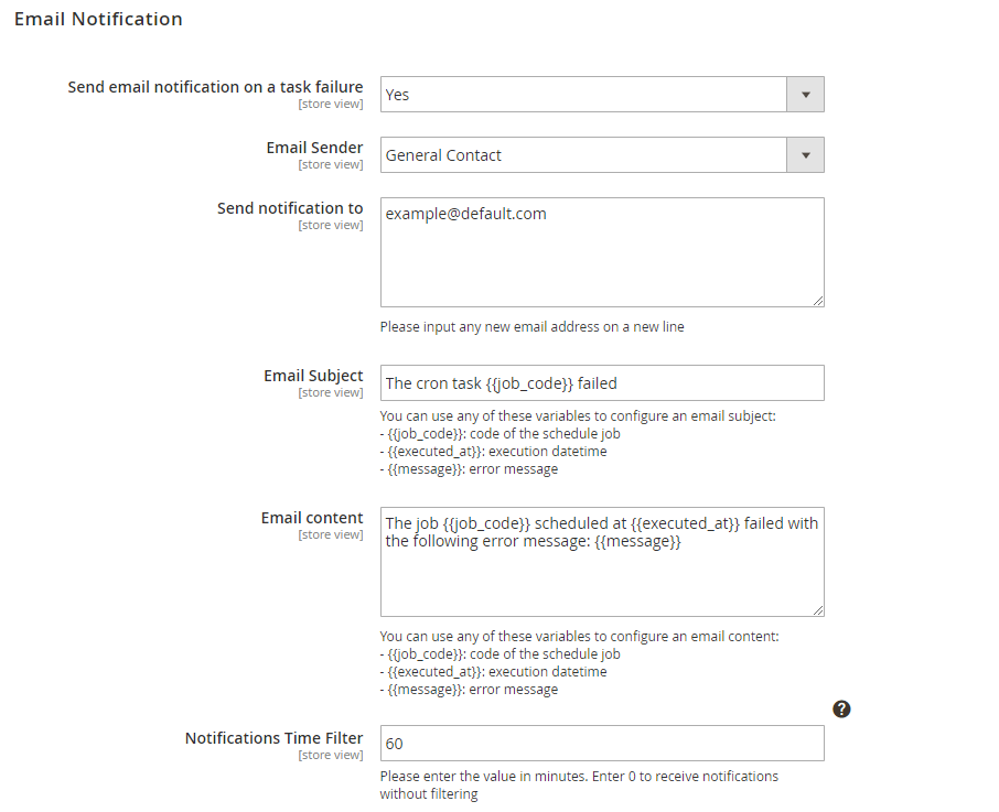 The extension allows to receive real-time error notifications on cron failures. To configure email notifications, go to Stores → Configuration → Amasty Extensions → Cron Scheduler.