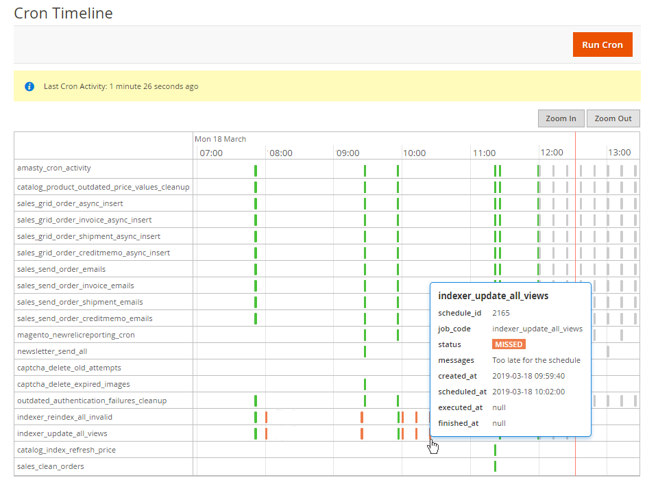 To view all scheduled and running cron tasks in chronological order, go to System → Cron Jobs Timeline.