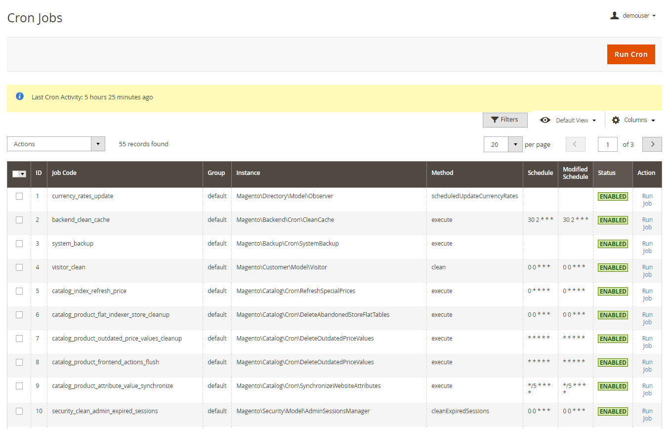 The extension gathers all cron jobs of third-party modules together with native Magento ones on a special Cron Jobs List grid. The grid provides you with sufficient info on cron jobs, including a cron task status, group, schedule, etc.