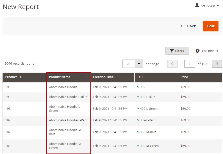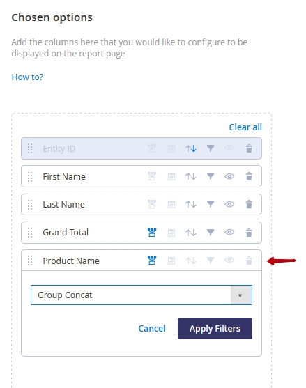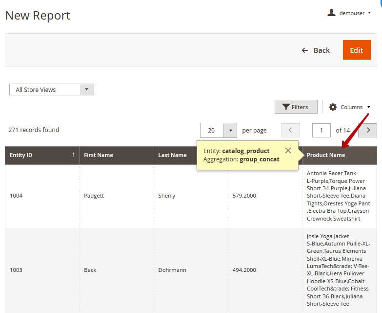 Or, as another example, let's add the Product Name column from the Catalog Product entity to our report and see how the group_concat aggregation works: