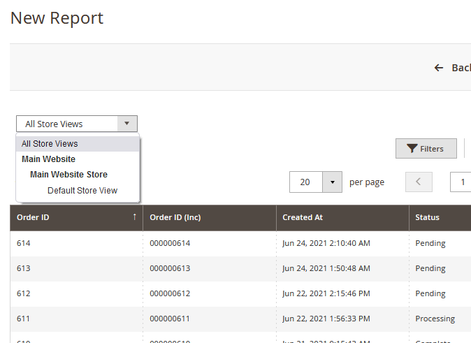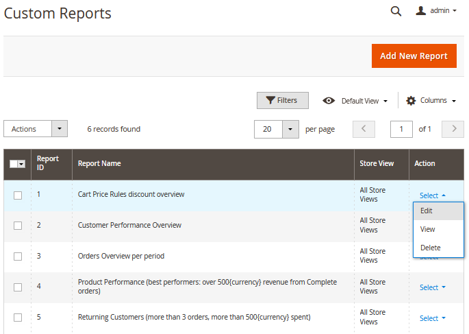 When the extension is installed, please navigate to Amasty → Custom Reports Builder → Amasty Custom Report Builder. Here you can see the Custom Reports grid with the 5 prebuilt reports that we have created for your convenience. Use these reports as they are or flexibly modify any of them according to your needs. Also, here you can create and manage your new custom reports.