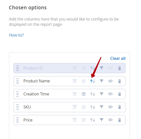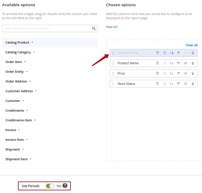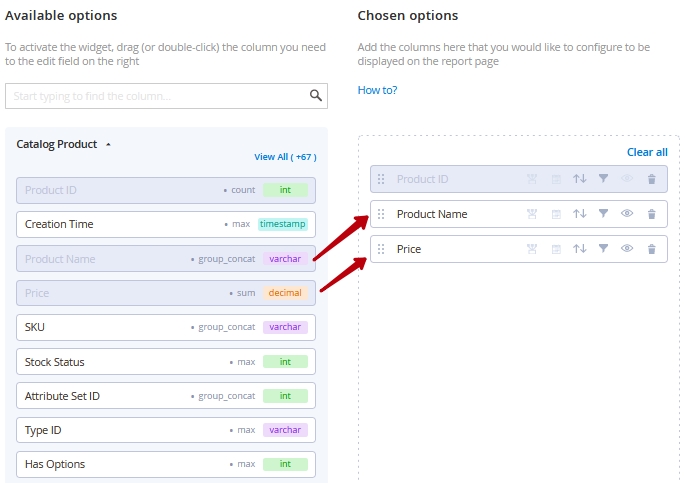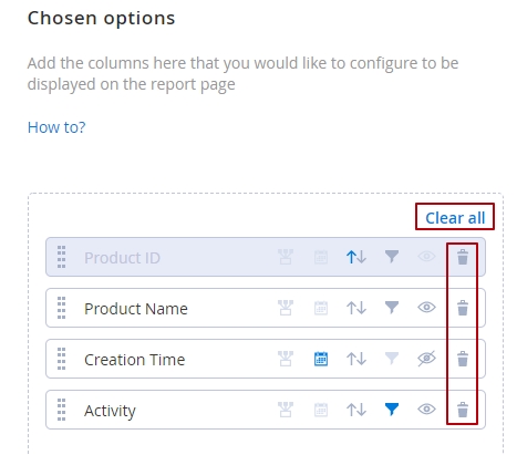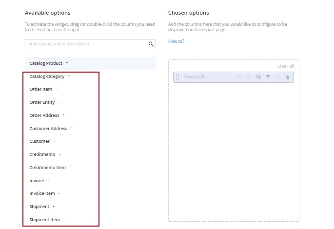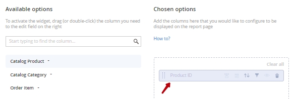 To add any of the Available options to the report, just expand the options blocks and drag and drop the options from the required blocks to the Chosen options tab. When you drop the option to the right column, it becomes disabled at the left one.