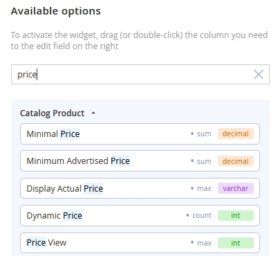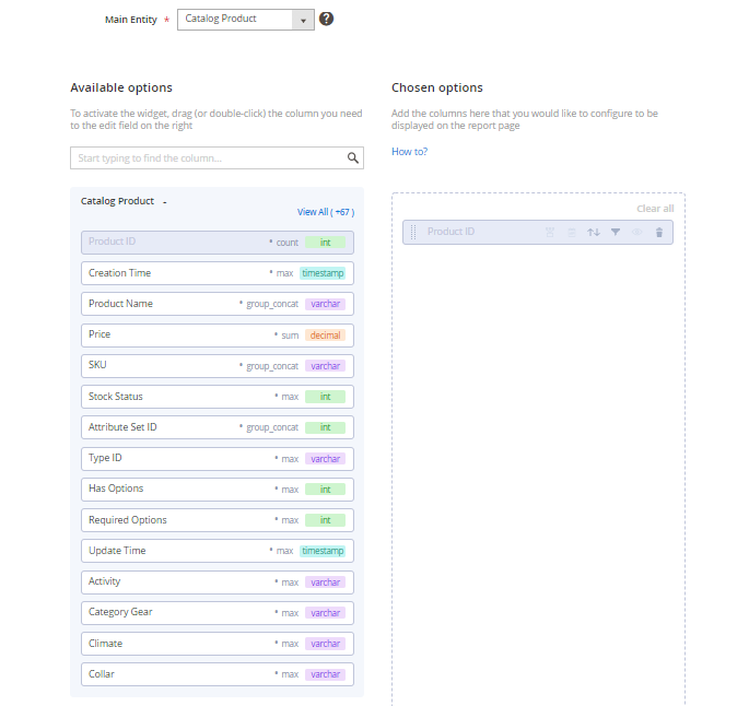 After you choose the main entity, you will see the option (column) block available for this entity. Each main entity has a specific block of options. For example, the Catalog Product entity has the following options block: