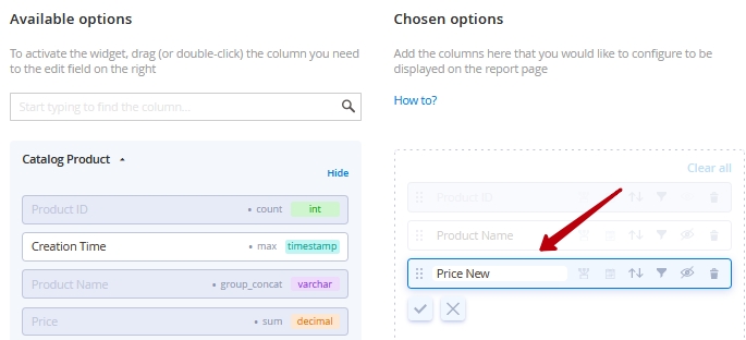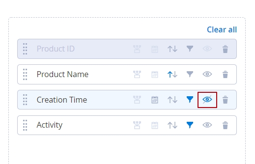 With this functionality, you can add various options to establish a connection between entities while not displaying these options in the report. To hide an option, just click an eye icon next to the option name. The option will not be displayed on the report view page, while the connection between entities will remain.