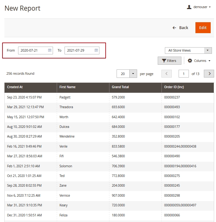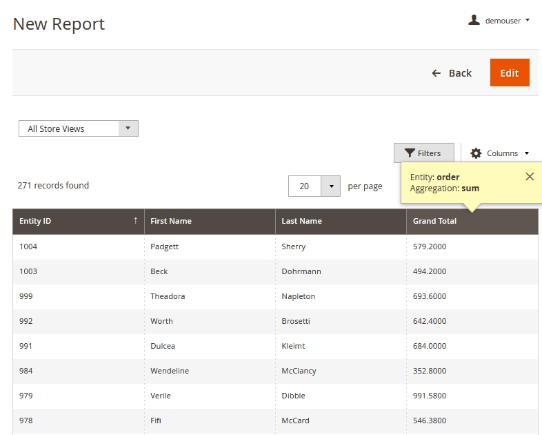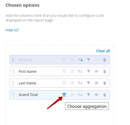 For example: if we build a report from Customer, and add the Grand Total column of the Order entity, the report can be displayed as the sum of the grand totals of customers orders, or as the average value of all customers orders, and so on - depending on the type of aggregation you choose.