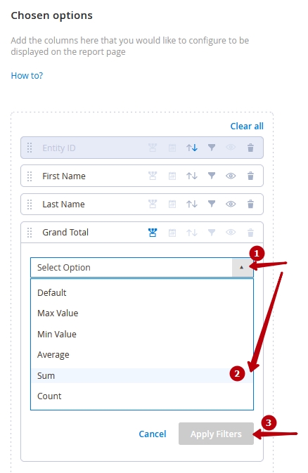 After adding several options to the report, you can apply various actions to options, like changing the type of aggregation, sorting, filtering, hiding, etc.