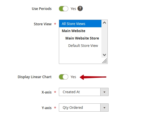 To visualize reports, you can enable the Display Linear Chart option. You will see 2 additional settings: X and Y axes, for which you can add the values from the report data.