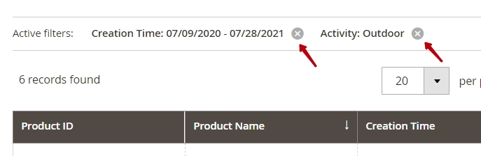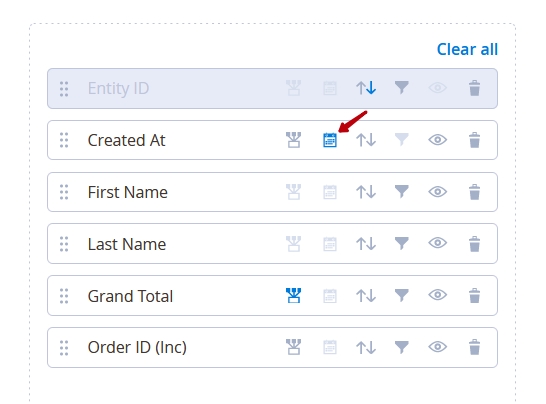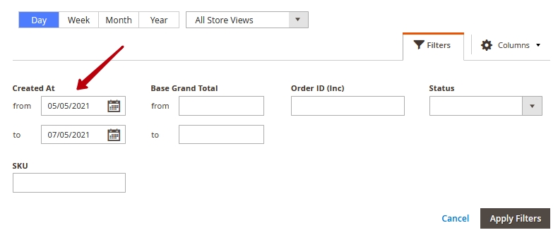 After enabling, filtering by dates becomes available for the chosen column with the from/to fields, which are displayed above the report grid on the report view page.