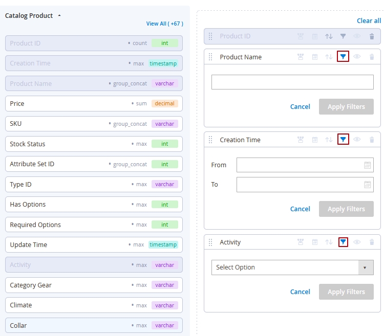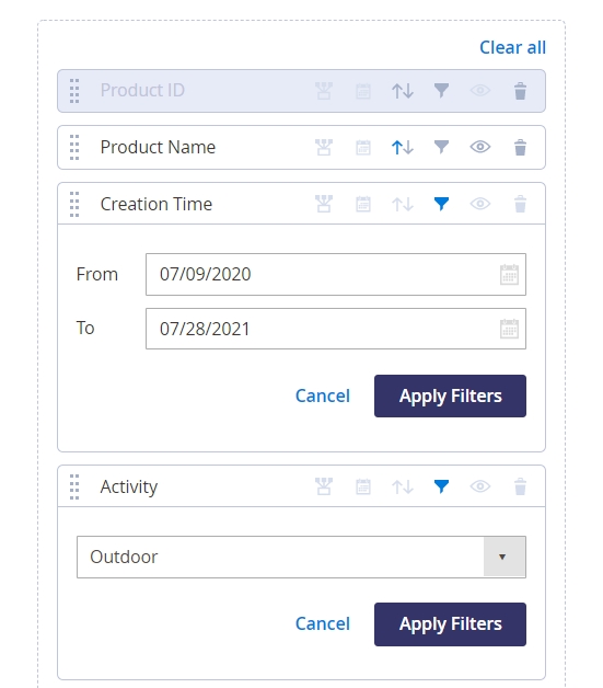 Enable the filtering for particular options by hitting the filter icon next to the option name. Then, specify the filtering parameters for these options and click the Apply Filters button. If you want to remove a filter from an option, just click the Cancel.