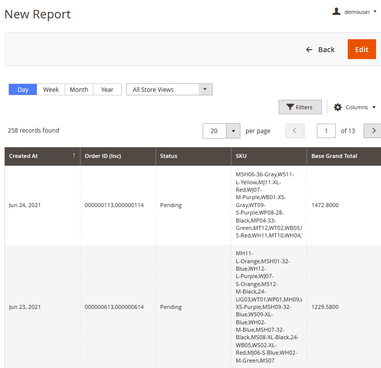 This way, we can see the list of orders and products by days/weeks/months/years. We can change the period using the options at the top of the grid.