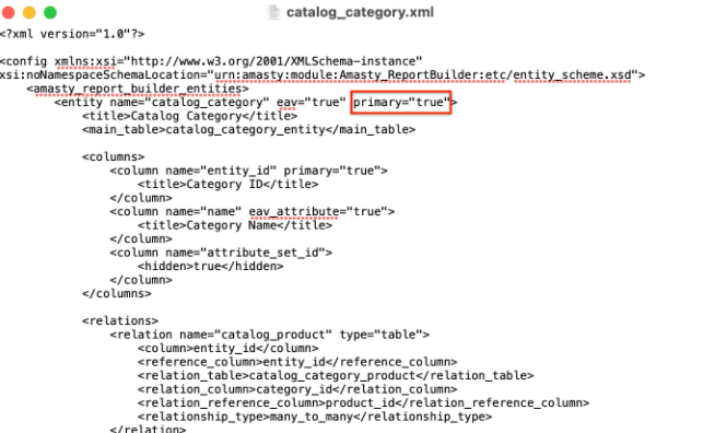 To do this, you need to add the primary=“true” mark to the XML file of the corresponding entity in the entity name line. The path to the entity files is as follows: app/code/Amasty/ReportBuilder/etc/ambuilder_entity_scheme. Next, open the file of the entity that you want to make the main one and insert primary=“true” in the entity name line.