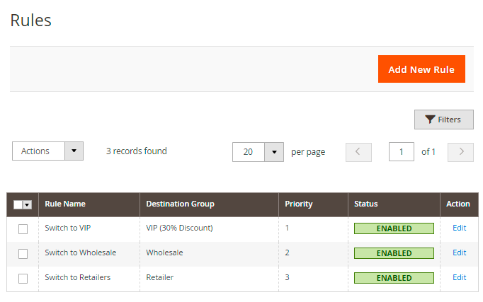 To create a new Magento 2 customer group rule, go to Customers → Customer Group Catalog → Rules. Here you can see all existing rules, filter them and perform mass delete action.