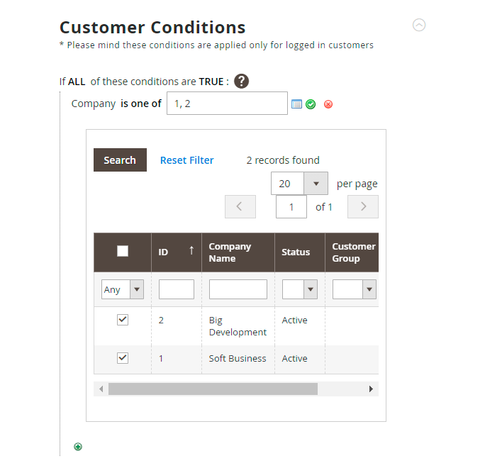 In the Customer Conditions you can create conditions that your customers should meet to have access to price, product or category pages, etc.
