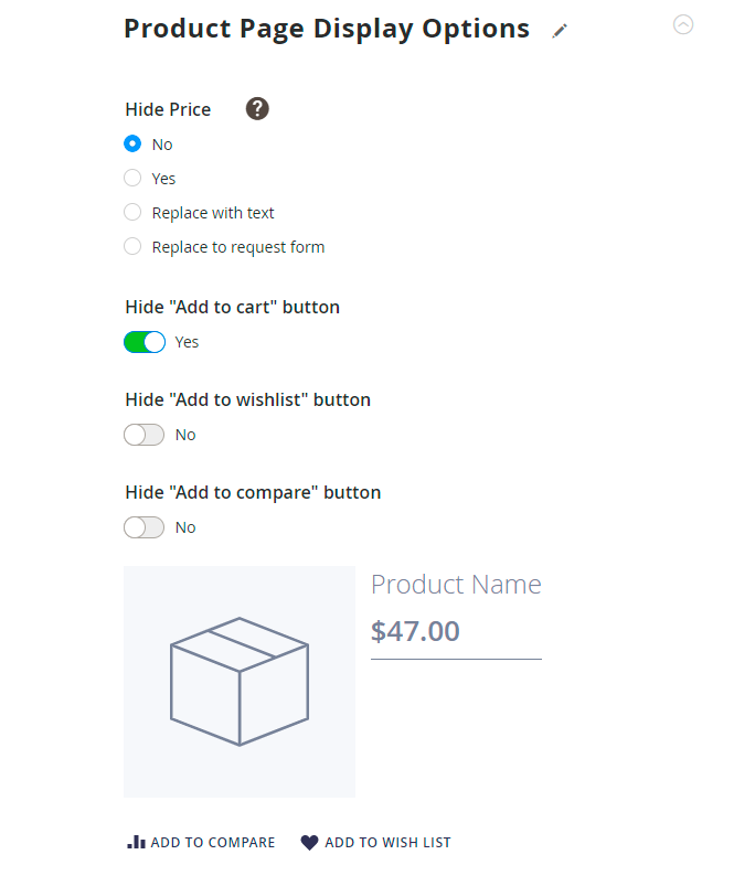 Hide “Add to wish list” button — enable this option to hide the Add to wish list button;