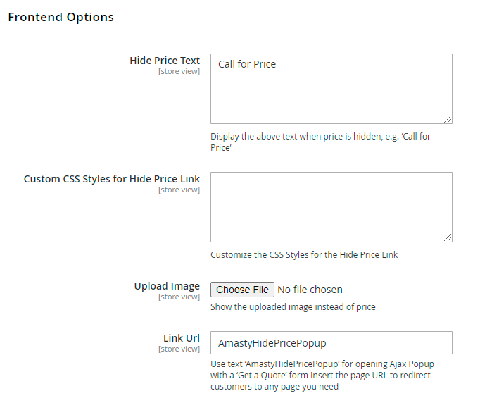 Link URL — specify URL to redirect visitors to any address or use AmastyHidePricePopup to show the Get a Quote form.
